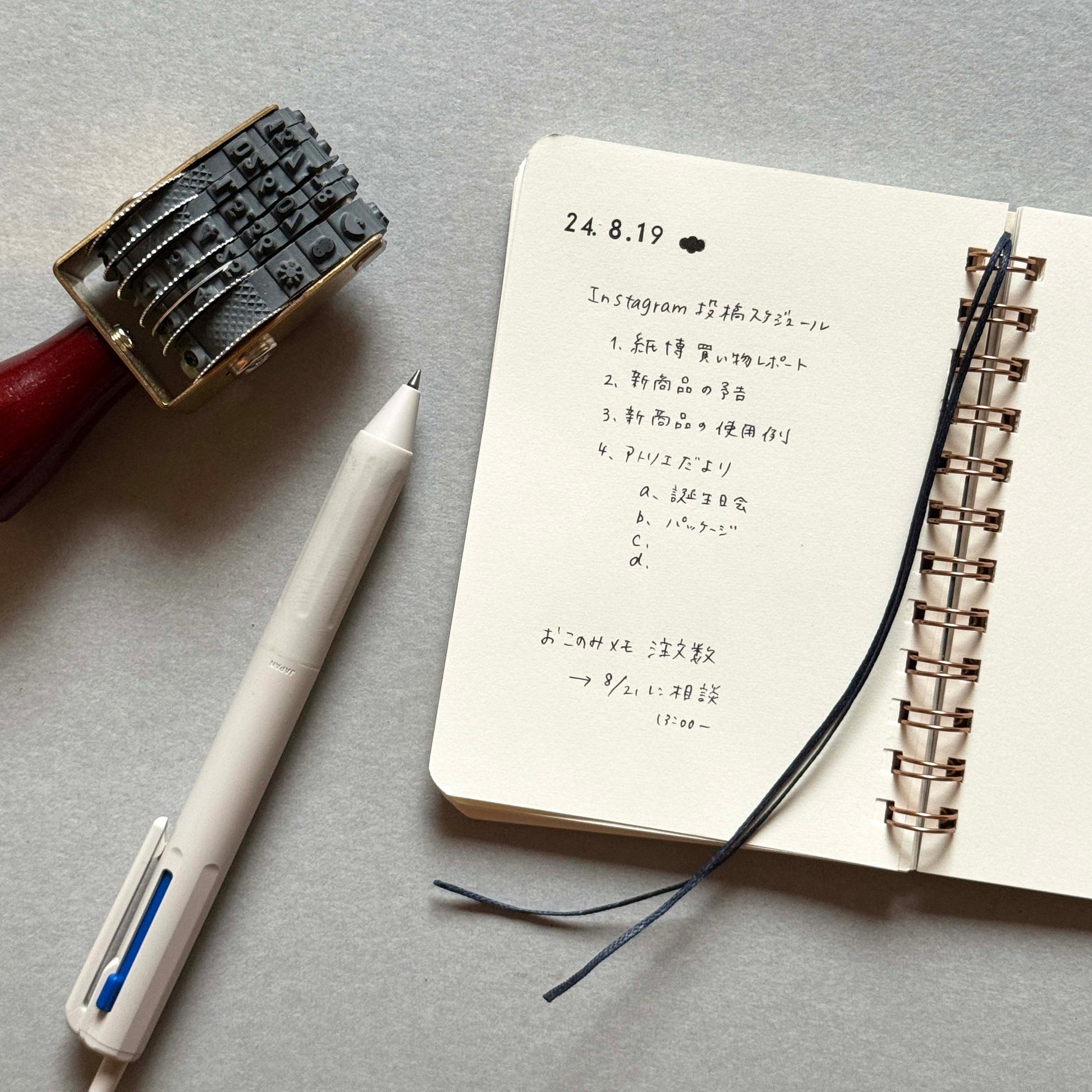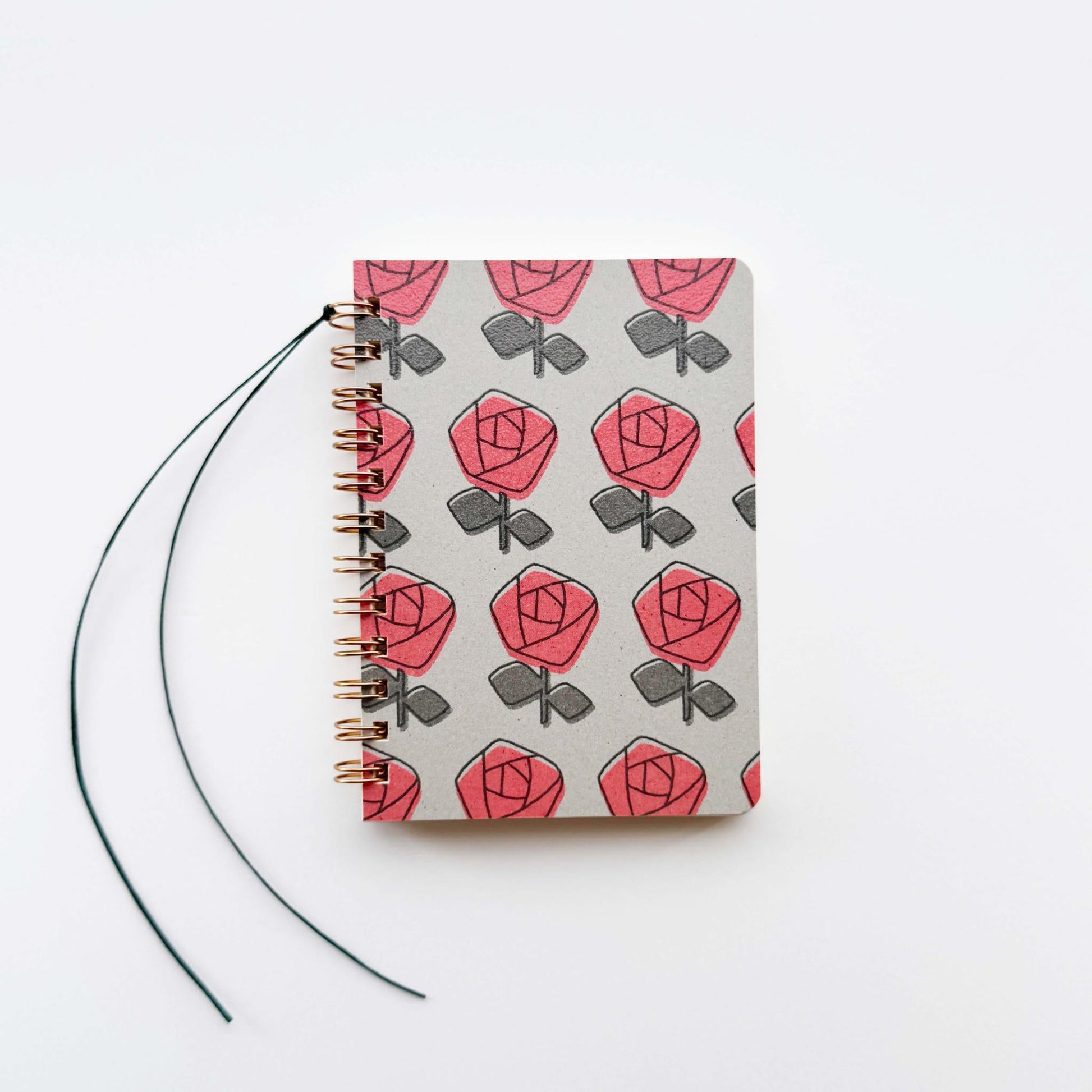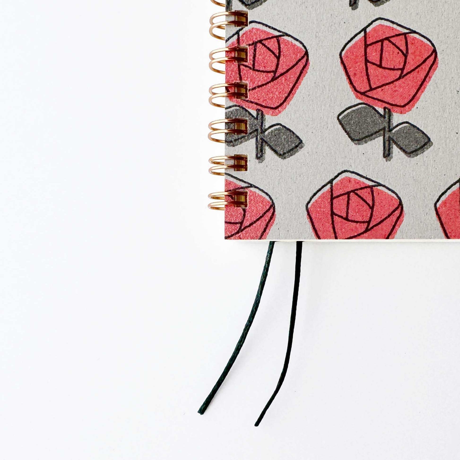 A compact, palm-sized ring notebook featuring two wax cord bookmarks that resemble little “shippo (tails).” The “Rose” design shows a chain of blooming roses, with slightly raised ink that pairs beautifully with the subtly textured paper. The inner pages are made from “Menuet” paper, known for its soft, airy texture and smooth writing experience with both pen and pencil. The two separate bookmarks allow you to mark different pages and use them as needed.