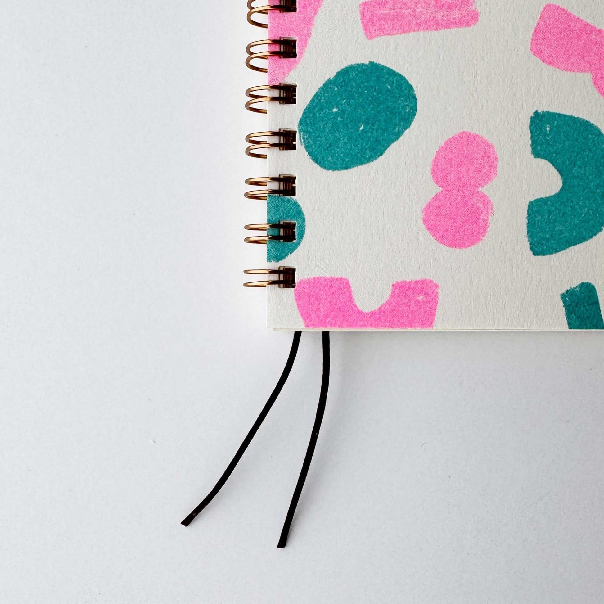 A compact, palm-sized ring notebook featuring two wax cord bookmarks that resemble little “shippo (tails). The “Shapes 04” design features a colorful pattern of large abstract forms scattered across the page, with slightly raised ink that pairs beautifully with the subtly textured paper for a rich tactile feel. The inner pages are made from “Menuet” paper, known for its soft, airy texture and smooth writing experience with both pen and pencil. The two separate bookmarks allow you to mark different pages and use them as needed.