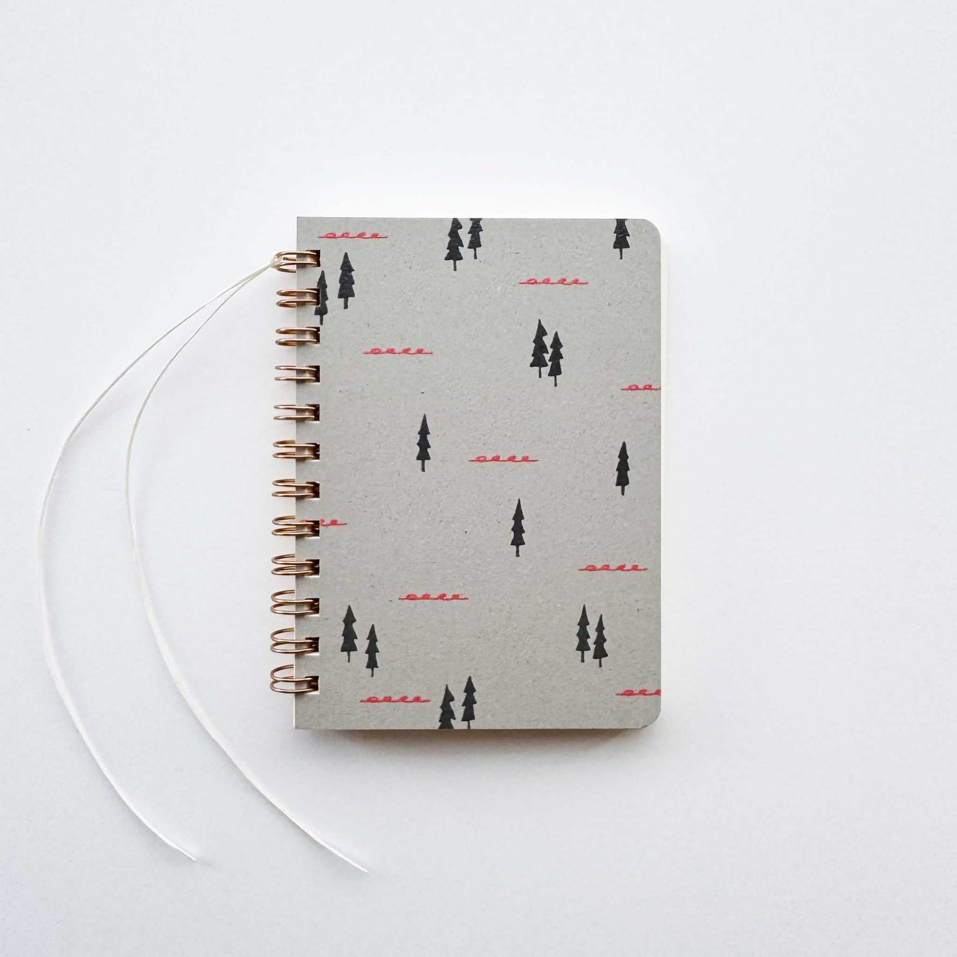 A compact, palm-sized ring notebook featuring two wax cord bookmarks that resemble little “shippo (tails).” The “Tree” design evokes a quiet, peaceful forest, with slightly raised ink that pairs beautifully with the subtly textured paper. The inner pages are made from “Menuet” paper, known for its soft, airy texture and smooth writing experience with both pen and pencil. The two separate bookmarks allow you to mark different pages and use them as needed.