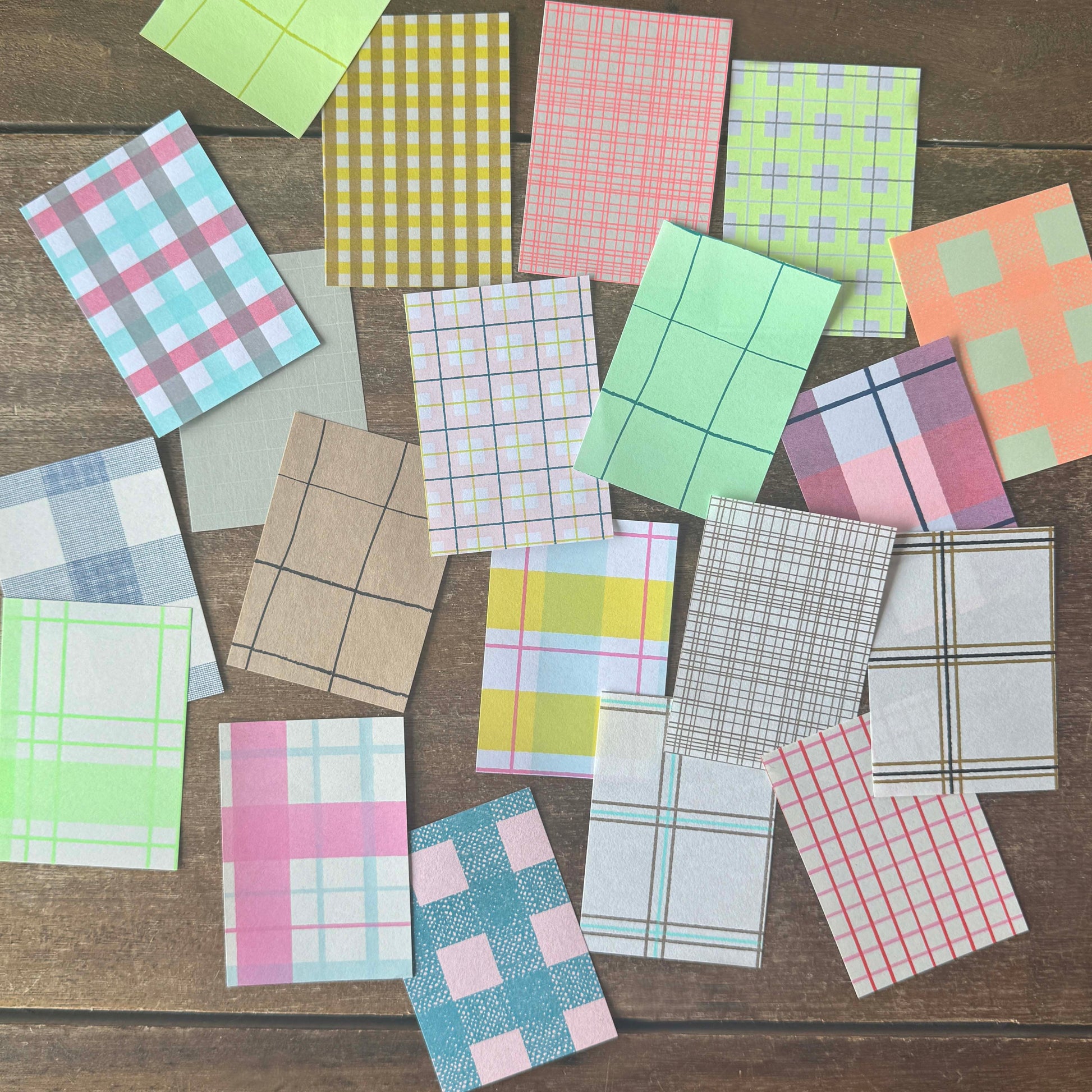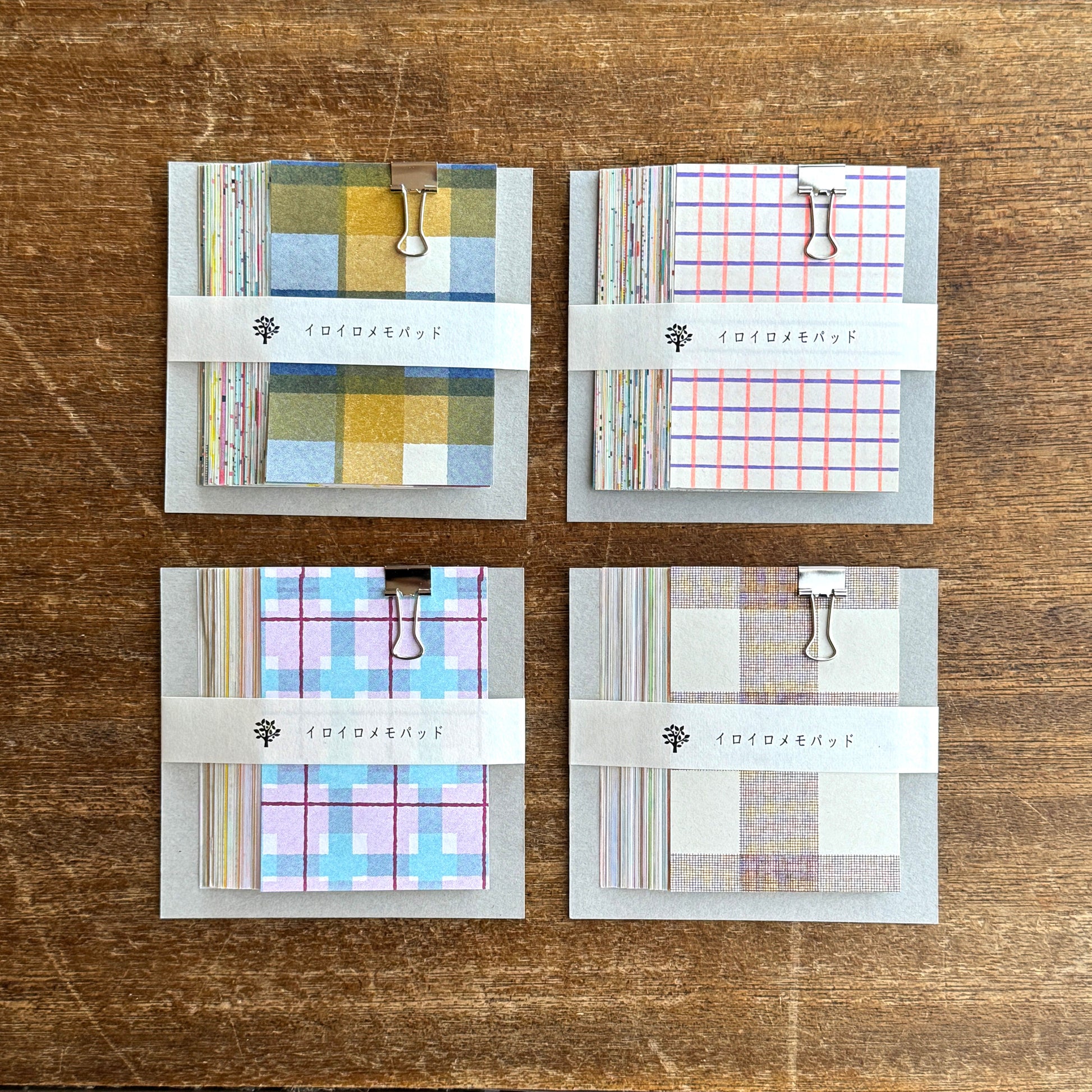 人気のイロイロメモパッドにチェック柄が登場しました。 さまざまな幅や色の線をかけ合わせたチェック柄がセットになっています。縦と横の線の組み合わせからできる組み合わせはまさに無限大。